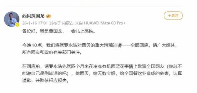 网易财经1月16日讯西贝餐饮创始人贾国龙发文称,“今晚10点华夏理财,我们将就罗永浩对西贝的重大污蔑诽谤一一全面回应。”