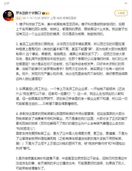 针对贾国龙将关店归因于“被污蔑”,罗永浩明确表示,没有企业能仅因被黑倒闭,自己创办的锤子科技曾被黑四年,最终倒闭是自身原因,与被黑无关。他指出西贝部分问题确属事实,“大部分就是预制菜”,并非所谓“污蔑”,仅冷冻西兰花成本高的问题在一定程度上被冤枉,但该争议是西贝开放厨房失控导致,且其公关应对失当。